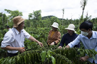In Vietnam, IDH's coffee projects support a long-term transition towards a more sustainable and low-emission coffee production by promoting regenerative agriculture and agroforestry focusing on blended service delivery and the sustainable use of agro-inputs and water. These efforts have been done to achieve a more robust coffee production and better incomes for smallholder farmers and have been crucial to take the sustainability approach beyond certification and verification. Middlemen and local cooperatives are important partners to roll out the delivery of services in Vietnam and play an essential role in changing growing techniques. Coffee roasters support the shift to a more sustainable production by increasing the amount of direct sourcing.